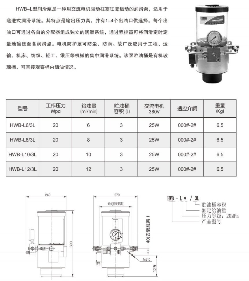 HWB-L6/3L,HWB-L8/3L,HWB-L10/3L,HWB-L12/3L,电动润滑泵