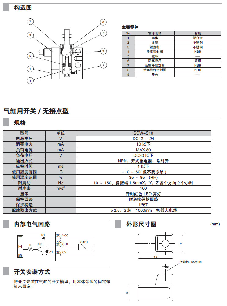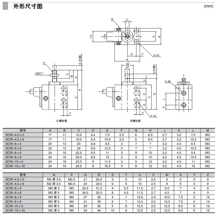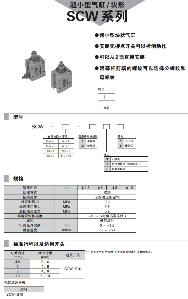 SCW-4.5×3,SCW-4.5×6,SCW-6×4,SCW-6×8,SCW-8×4,SCW-8×8,SCW-10×5,超小型块状气缸