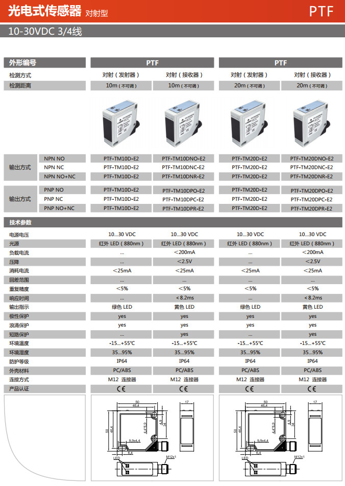 PTF-TM10D-E2,PTF-TM10DNO-E2,PTF-TM10DNC-E2,PTF-TM20D-E2,PTF-TM20DNO-E2,PTF-TM20DNC-E2,光电式传感器