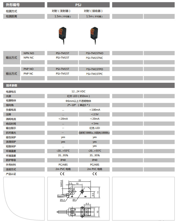 PSJ-TM15T,PSJ-TM15TNO,PSJ-TM15TNC,PSJ-TM15TPO,PSJ-TM15TPC,光电式传感器