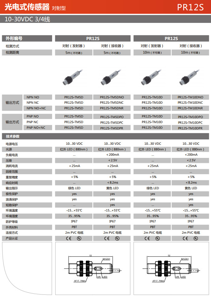PR12S-TM5D,PR12S-TM5DNO,PR12S-TM5DNC,PR12S-TM5DNR,PR12S-TM10D,PR12S-TM10DNO,PR12S-TM10DNC,光电式传感器