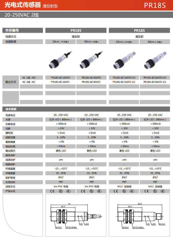 PR18S-BC10ATO,PR18S-BC10ATC,PR18S-BC40ATO,PR18S-BC40ATC,PR18S-BC10ATO-E2,光电式传感器