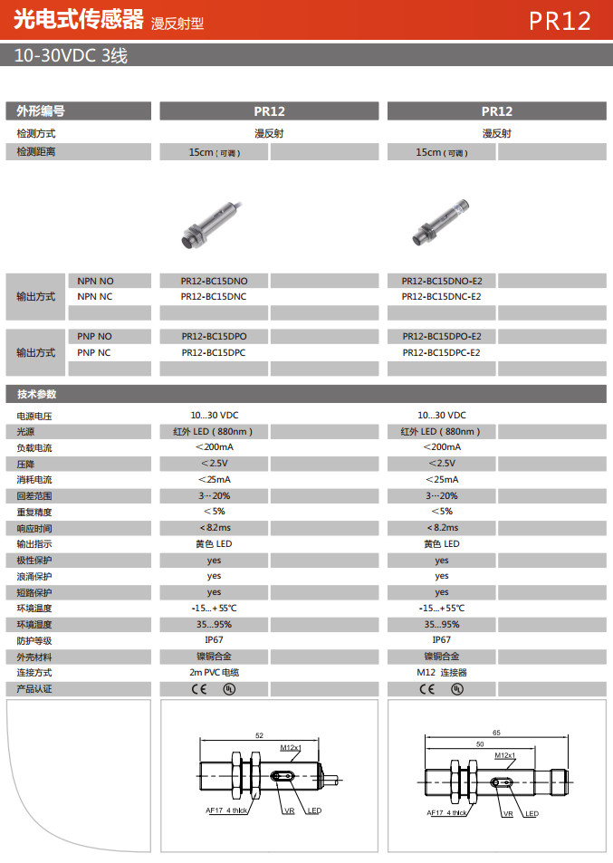 PR12-BC15DNO,PR12-BC15DNC,PR12-BC15DPO,PR12-BC15DPC,PR12-BC15DNO-E2,PR12-BC15DNC-E2,光电式传感器