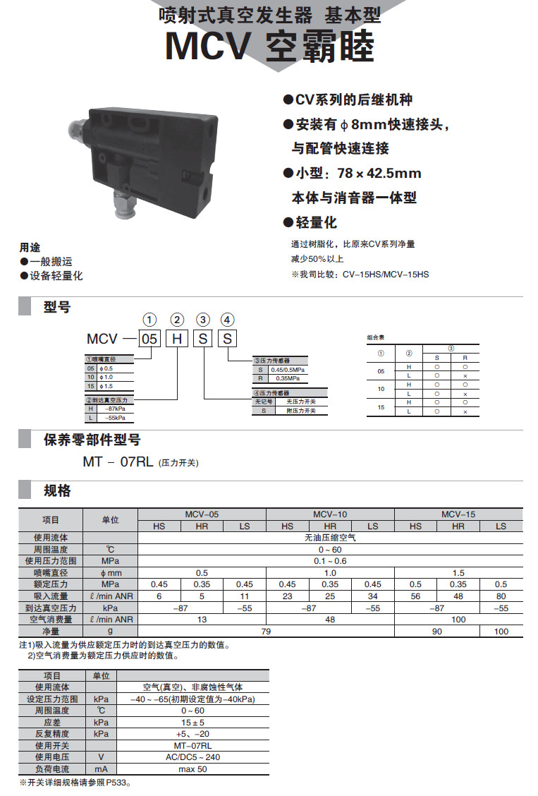 MCV-05HSS,MCV-10HS,MCV-15HSR,MCV-05LR,MCV-10LSS,MCV-15LS,喷射式真空发生器