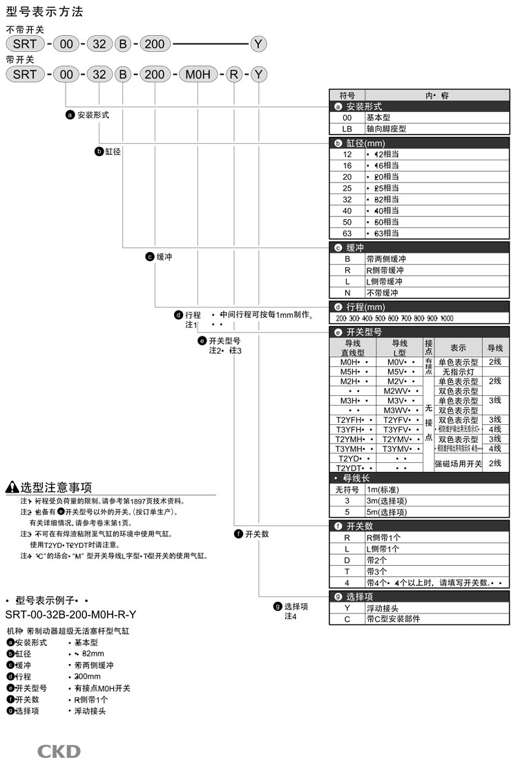 SRT-00-12B-200,SRT-LB-12B-200,SRT-LB-63B-700,SRT-00-63B-1000,CKD无活塞杆型气缸