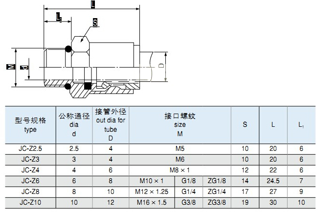 一、JC系列插入式管接头,适用于连接硬质、半硬质尼龙管、塑料管,最大工作压力为1.0MPa。该系列管接头安装方便,密封可