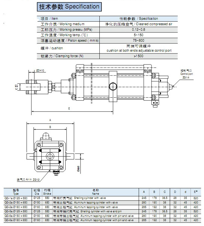 QG-1aΦ125×550,QG-2aΦ150×650,QG-5aΦ125×550,QG-6aΦ150×650,QG-6aΦ160×650,QG-2aΦ160×650,打壳气缸