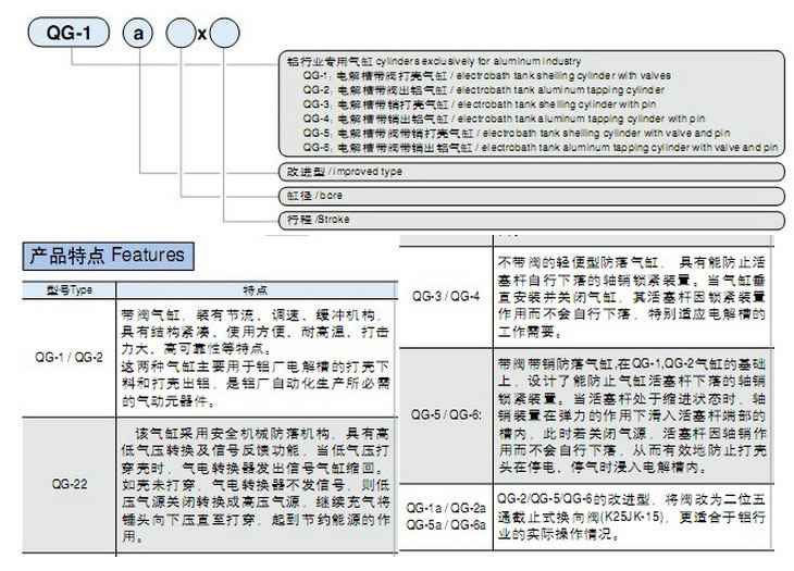 QG系列铝行业专用气缸分为六个品种QG-1~QG-6,针对铝厂电解槽打壳和出铝的不同需要,可酌情选用。