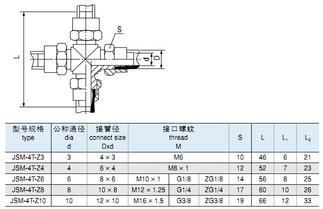 JSM-4T-Z3,JSM-4T-Z4,JSM-4T-Z6,JSM-4T-Z8,JSM-4T-Z10,锁母式四通终端管接头