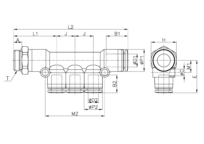 Model | ∅D1 | ∅D2 | ∅P1 | ∅P2 | T | L1 | L2 | E | ∅C | A | B1 | B2 | J | M1 | M2 | H(Hex) | ORIFICE | WEIGHT(g) | EA(BOX) |