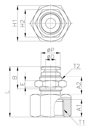 Model | ¢D | ¢P | T1 | T2 | L | E | A1 | A2 | B | H1(Hex) | H2(Hex) | ORIFICE | WEIGHT(g) | BOX(EA) |