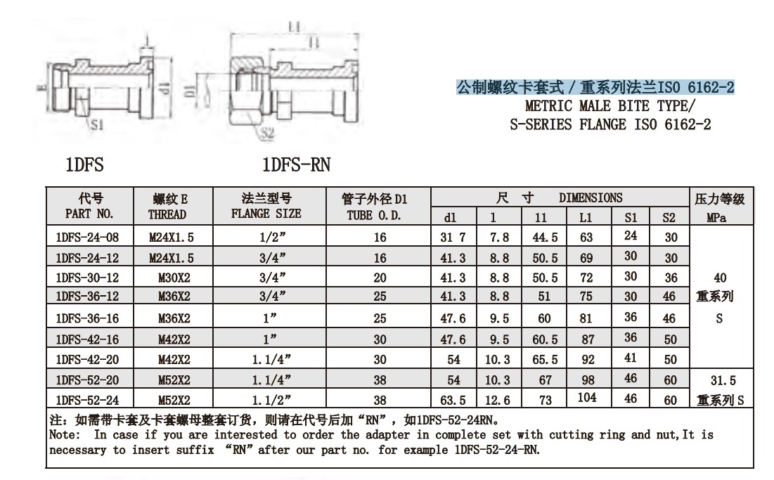 1DFS-24-08,1DFS-30-12,1DFS-36-12,1DFS-42-16,1DFS-52-20,1DFS-24-12,公制螺纹卡套接头