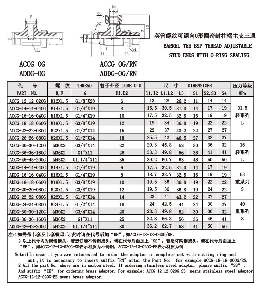 ACCG-12-12-020G,ACCG-14-14-040G,ACCG-16-16-040G,ADDG-30-30-120G,ADDG-36-36-160G,公制螺纹卡套接头