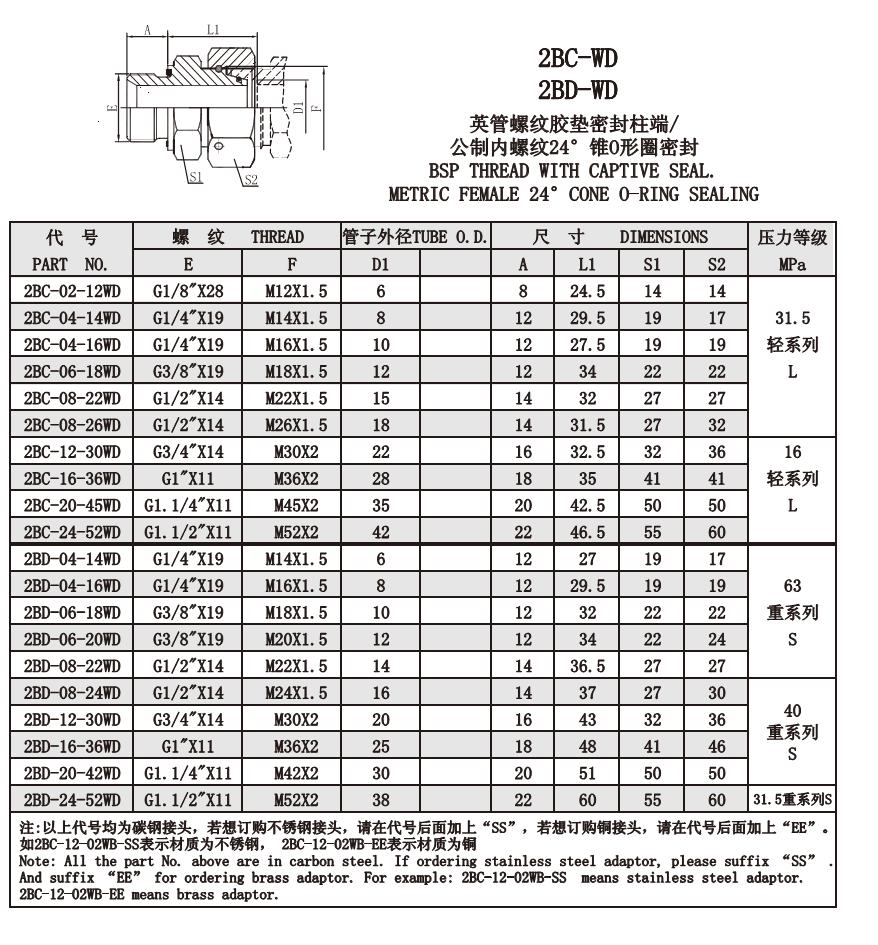 2BC-02-12WD,2BC-04-14WD,2BC-06-18WD,2BD-16-36WD,2BD-20-42WD,2BD-24-52WD,公制螺纹卡套接头