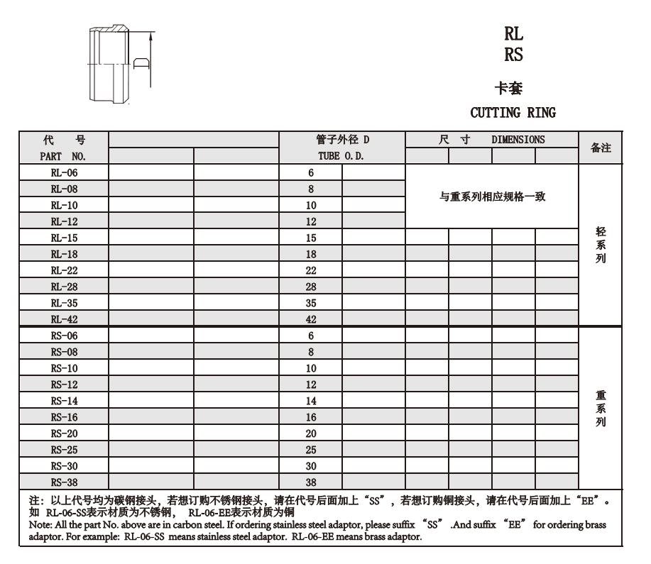 RL-06,RL-08,RL-10,RL-12,RS-16,RS-20,RS-25,RS-30,RS-38,公制螺纹卡套接头