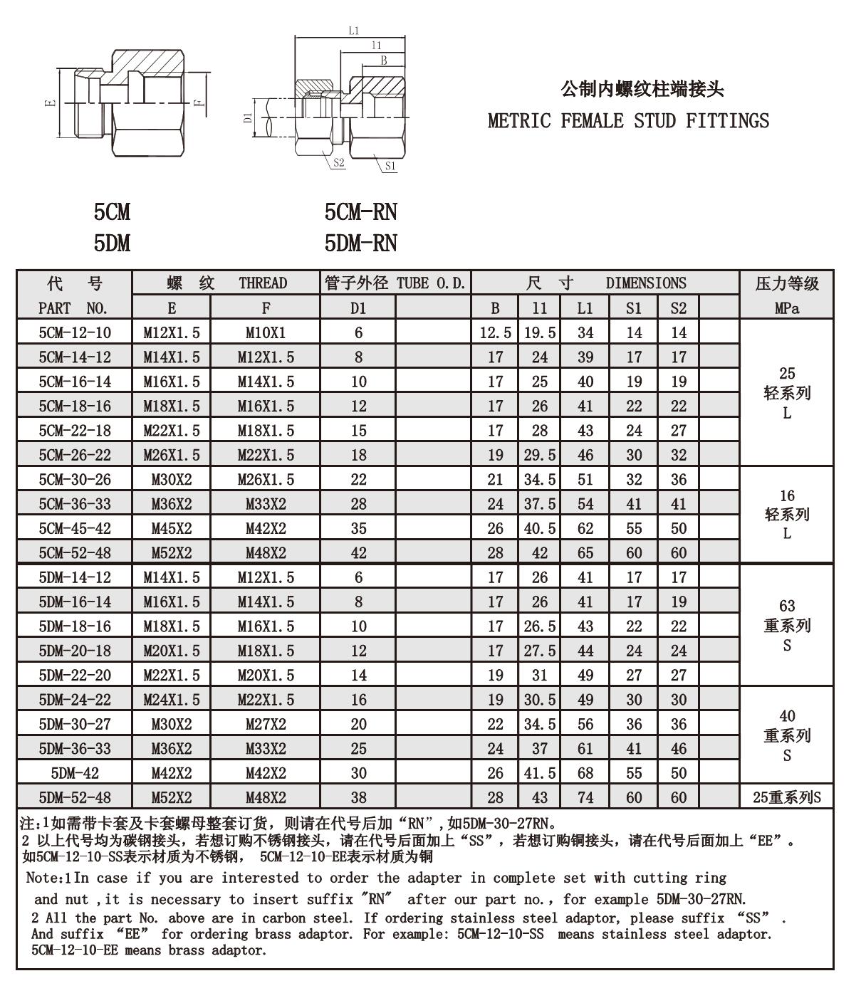 5CM-12-10,5CM-14-12,5CM-16-14,5CM-18-16,5CM-22-18,5DM-30-27,5DM-36-33,5DM-42,公制螺纹卡套接头