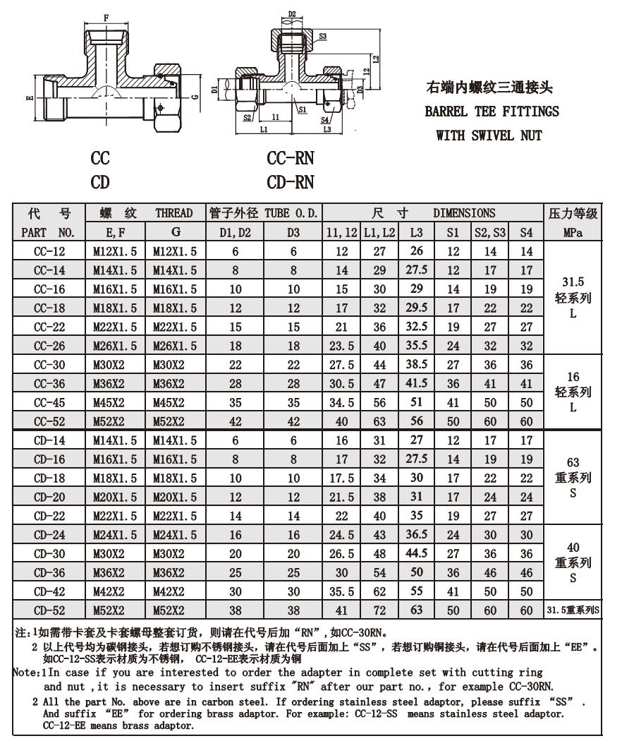 CC-12,CC-26,CC-30,CC-36,CC-45,CC-52,CD-36,CD-42,CD-52,内螺纹三通接头