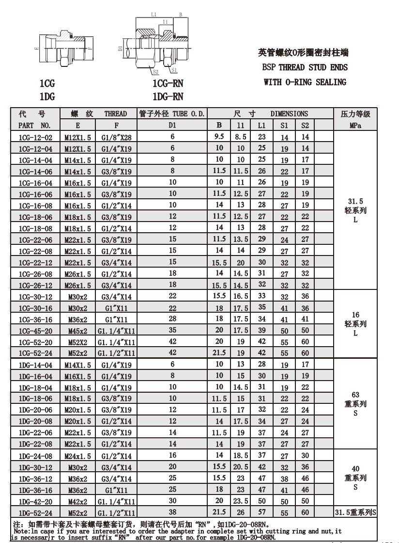 1CG-12-02,1CG-14-04,1CG-16-06,1CG-18-06,1DG-30-12,1DG-42-20,1DG-52-24,公制螺纹卡套接头