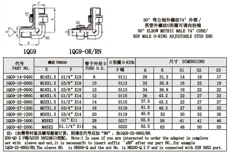 1QG9-14-040G,1QG9-16-060G,1QG9-18-060G,1QG9-27-120G,1QG9-39-160G,1QG9-45-200G,锥面密封接头
