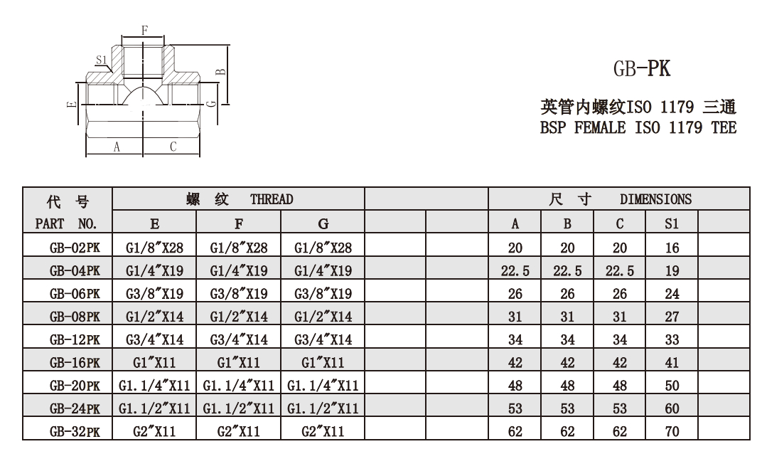 GB-02PK,GB-04PK,GB-06PK,GB-08PK,GB-12PK,GB-16PK,GB-20PK,GB-24PK,GB-32PK,内螺纹三通接头