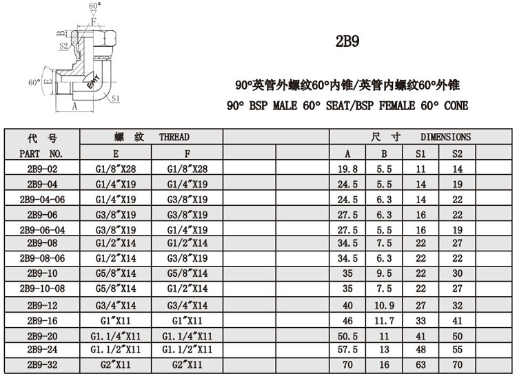 2B9-02,2B9-04,2B9-06,2B9-08,2B9-10,2B9-12,2B9-16,2B9-20,2B9-24,2B9-32,锥面密封接头