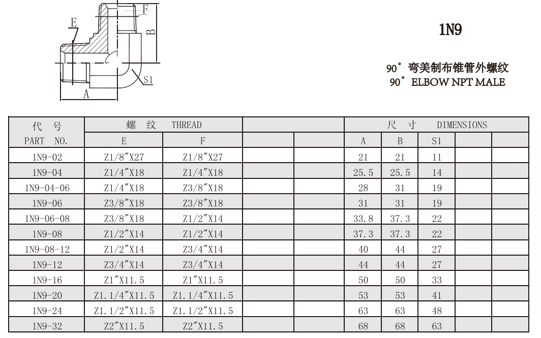 1N9-02,1N9-04,1N9-06,1N9-08,1N9-12,1N9-16,1N9-20,1N9-24,1N9-32,外螺纹接头