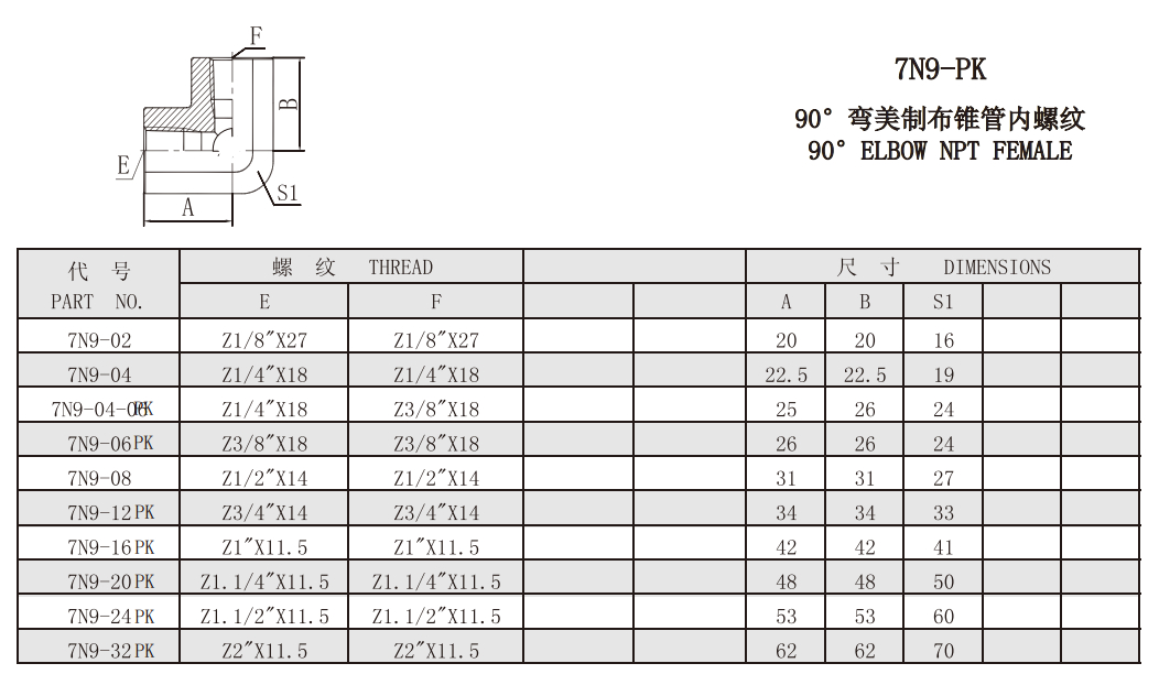 7N9-02,7N9-04,7N9-06PK,7N9-08,N9-12PK,N9-16PK,N9-20PK,N9-24PK,N9-32PK,内螺纹接头