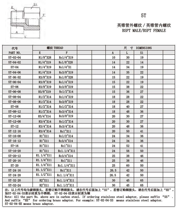 5T-02,5T-04,5T-06,5T-08,5T-12,5T-16,5T-20,5T-24,5T-32,内螺纹接头