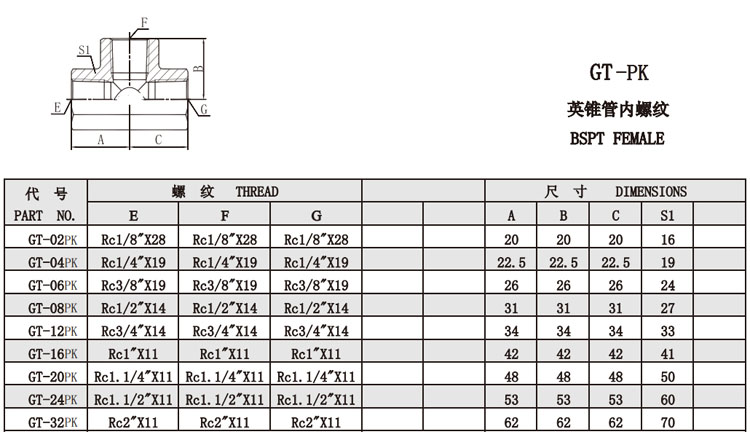GT-02PK,GT-04PK,GT-06PK,GT-08PK,GT-12PK,GT-16PK,GT-20PK,GT-24PK,GT-32PK,英锥管内螺纹接头