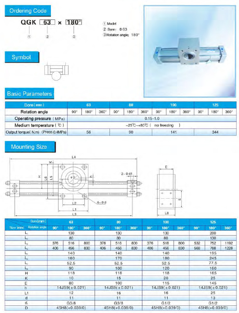 QGK63X90,QGK63X180,QGK80X180,QGK80X360,QGK100X360,QGK125X90,Shinya齿轮齿条摆动油缸