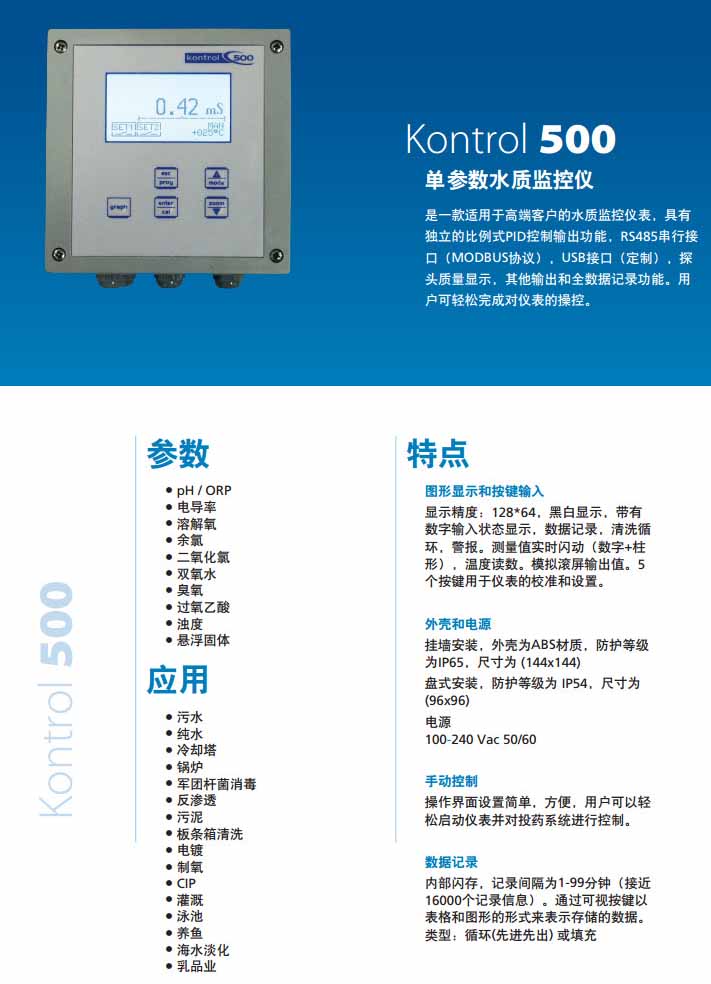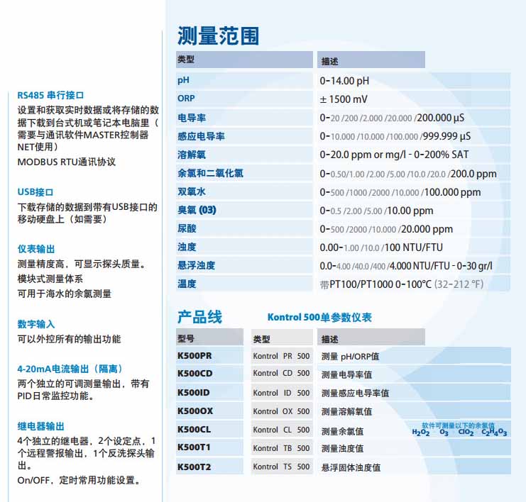 K500PR,K500CD,K500ID,K500OX,K500CL,K500T1,K500T2,SEKO单参数水质监控仪
