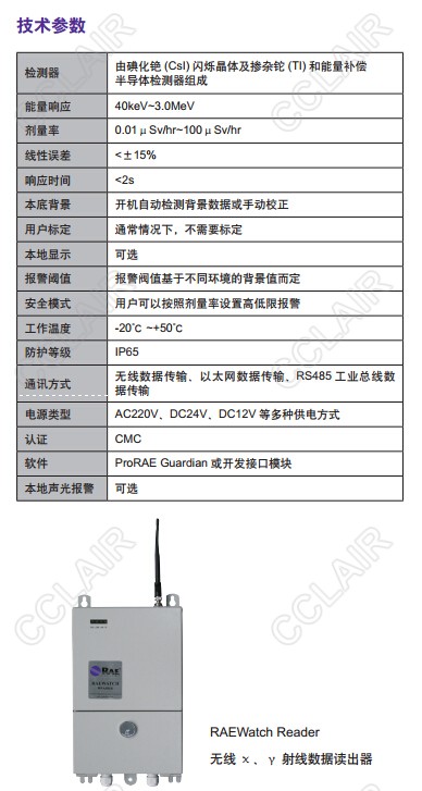 RAEWatch 是一款高灵敏度、快速响应型χ、γ 射线检测器,能在2 秒内对现场剂量率变化发出报警。应用的主要领域是区域辐射场监测和工业在线固定式应用放射源的剂量监测。
