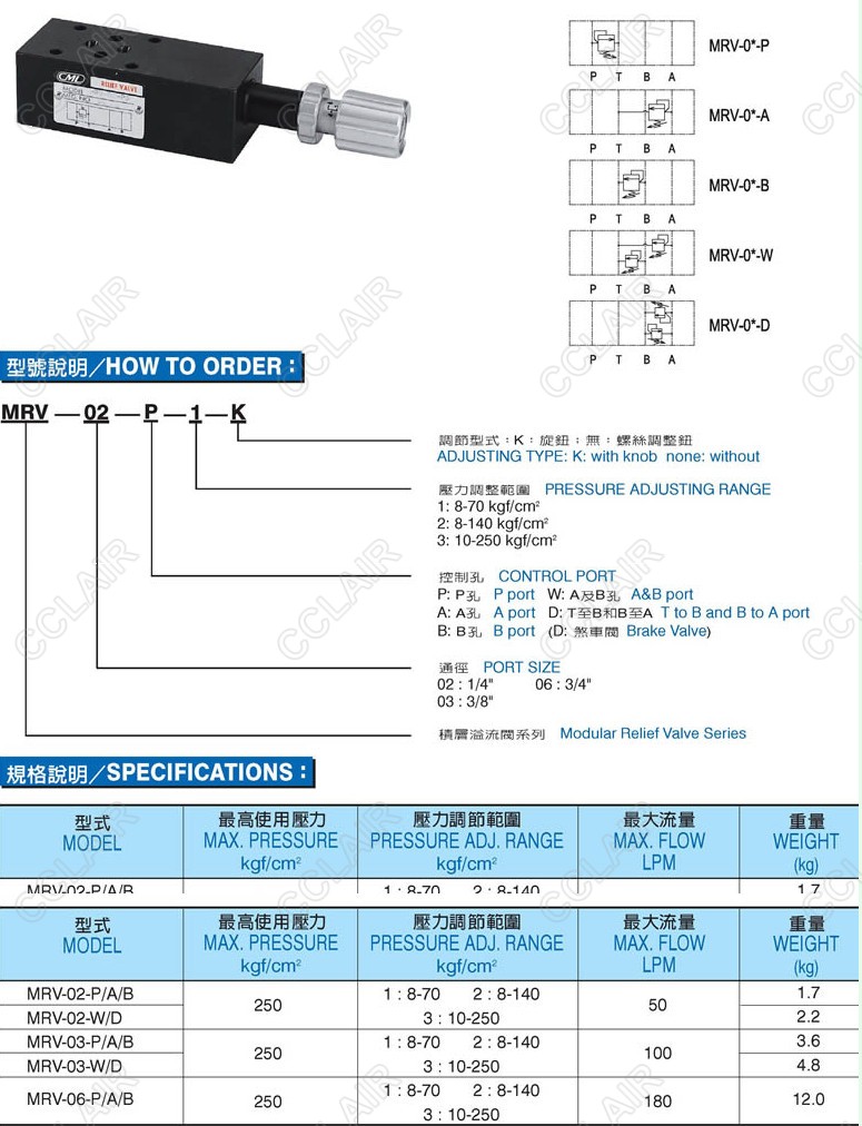 MRV-02-P-1-K,MRV-02-A-2,MRV-03-P-3-K,MRV-06-P-1,MRV-06-B-3,积層型溢流阀CML