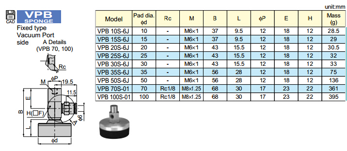 VPB10S-6J,VPB15S-6J,VPB20S-6J,VPB25S-6J,VPB30S-6J,VPB50S-6J,VPB70S-01,VPB100S-01,VPB35S-6J,PISCO真空吸盘