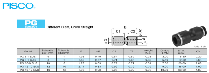 PG6-4SUS,PG8-6SUS,PG10-8SUS,PG12-10SUS,PG16-12SUS,PISCO快速接头