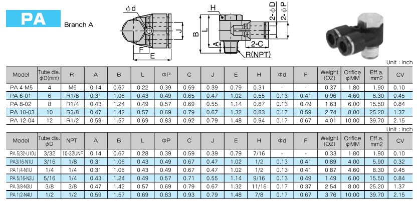 PA5/32-U10U,PA3/16-N1U,PA1/4-N1U,PA5/16-N2U,PA3/8-N3U,PA1/2-N4U