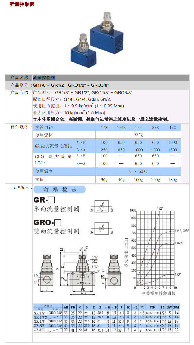 GR1/S",GR1/4"S,GR1/4",GR3/8",GR1/2",GRO1/S",GRO1/4",GRO3/8",POSU流量控制阀