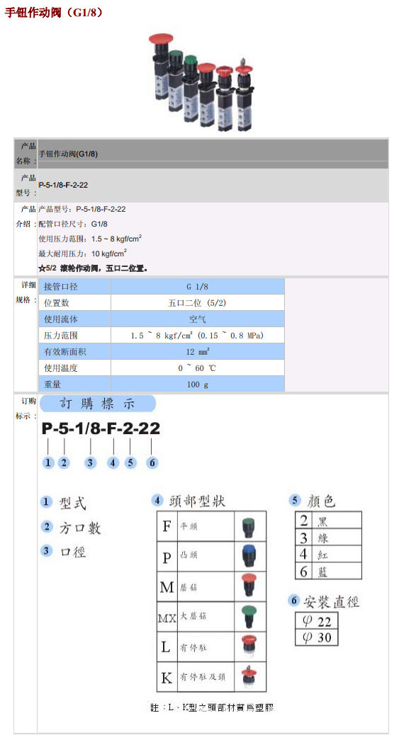 P-5-1/8-F-2-22,POSU手钮作动阀