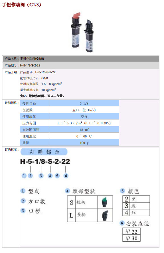 H-5-1/8-S-2-22,POSU手钮作动阀