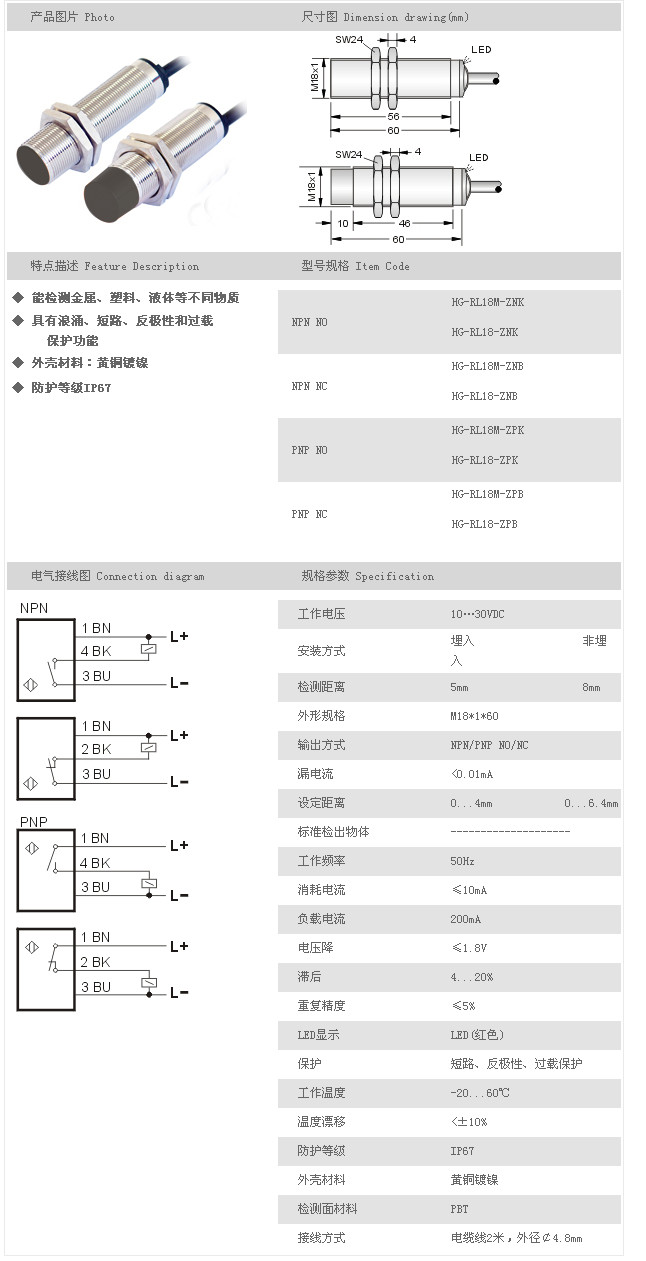 电容式接近传感器 HG-RL18M-ZNK,HG-RL18-ZNK,HG-RL18M-ZNB,HG-RL18-ZNB,HG-RL18M-ZPK,HG-RL18-ZPK,HG-RL18M-ZPB,HG-RL18-ZPB,