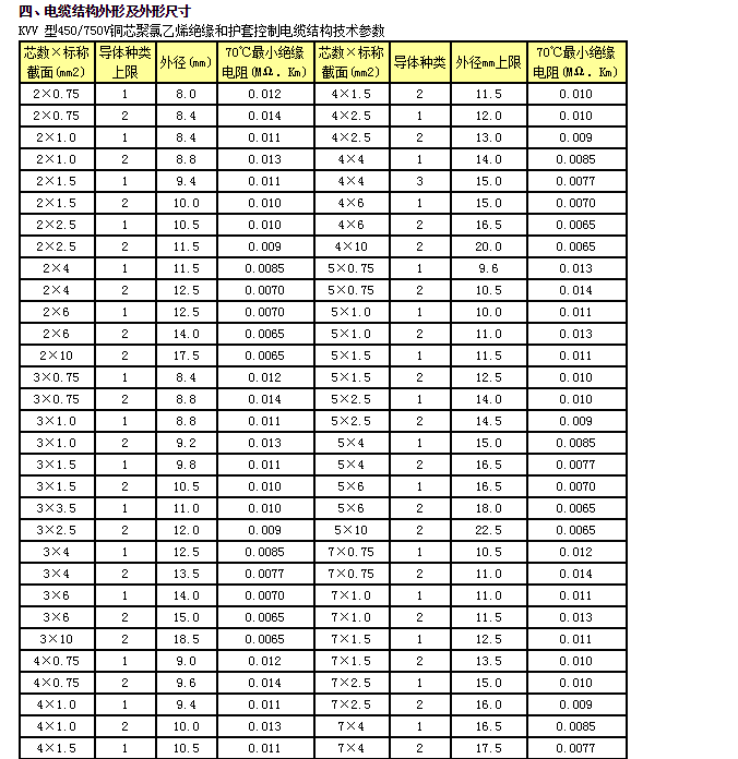 KVV | 铜芯聚氯乙烯绝缘氯乙烯护套控制电缆 | 敷设在室内、电缆沟、管道固定场合 |