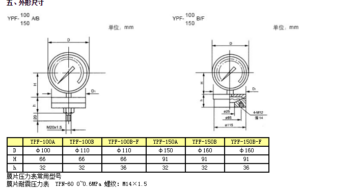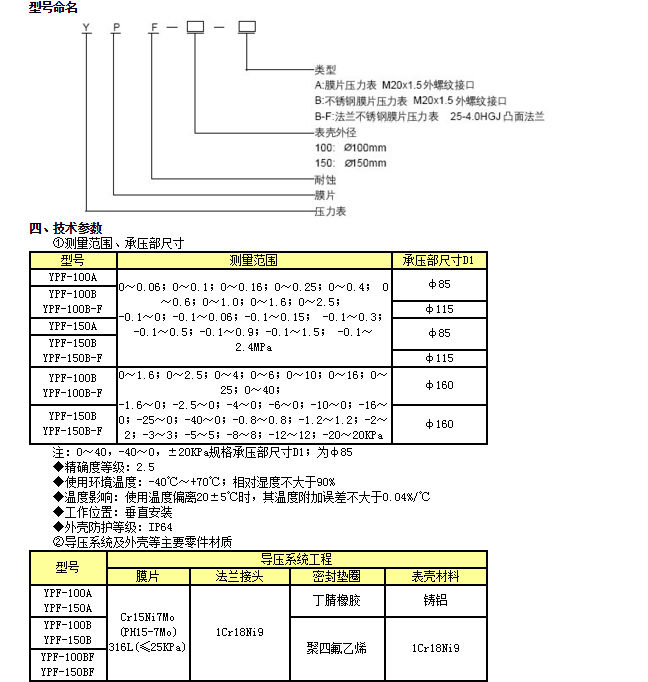 型号: YPF-100A,YPF-100B,YPF-100B-F,YPF-150A,YPF-150B,YPF-150B-F,膜片压力表
