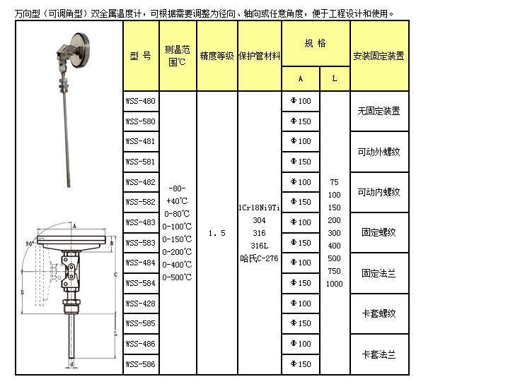 WSS-480,WSS-482,WSS-484,WSS-486,双金属温度计