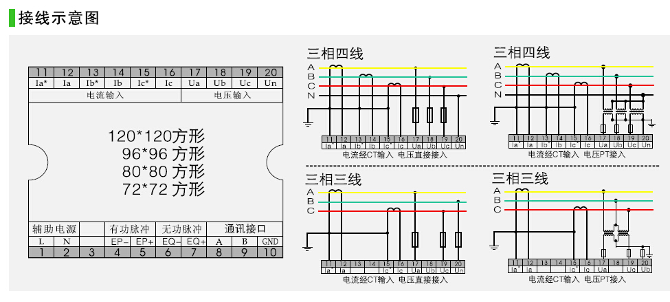 视在功率 有功电能 无功电能(计量)RS485通讯 三排LED数码管显示,96*96mm外形
