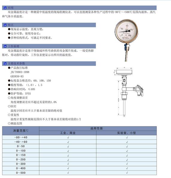 双金属温度计是一种测量中低温度的现场检测仪表。可以直接测量各种生产过程中的-80℃~+500℃范围内液体、蒸汽和气体介质温度。