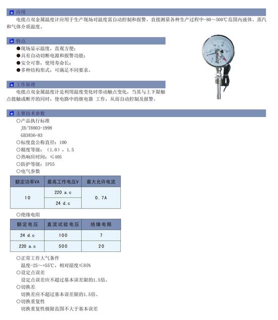 电接点双金属温度计应用于生产现场对温度需自动控制和报警。直接测量各种生产过程中-80~500℃范围内液体、蒸汽和气体介质温度。