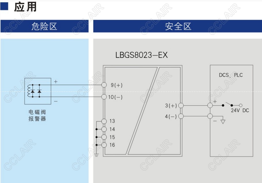 具有防雷击浪涌保护功能的开关量输出安全栅。它的功能是将安全区的电源通过开关控制,驱动危险区的现场本安设备,它适用于驱动如电磁阀、声光报警器等一些小功率本安设备。输入输出隔离,允许控制开关直接连到24DC供电回路的任一端。