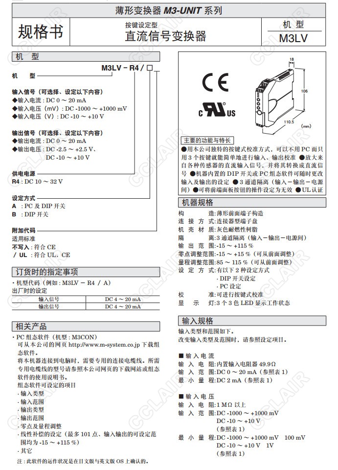 M3LV,M3LV-R4/A,M3LV-R4/B,M3LV-R4/A/UL,M3LV-R4/B/UL,直流信号变换器(按键设定型)