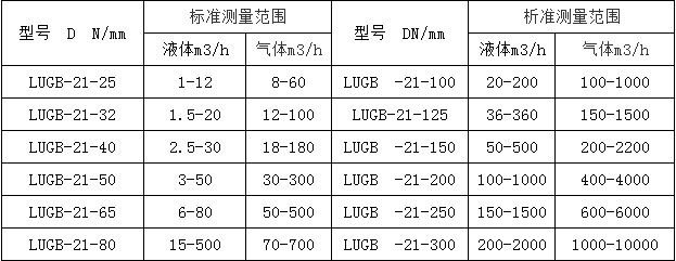 型号 D N/mm | 标准测量范围 | 型号 DN/mm | 析准测量范围 | ||