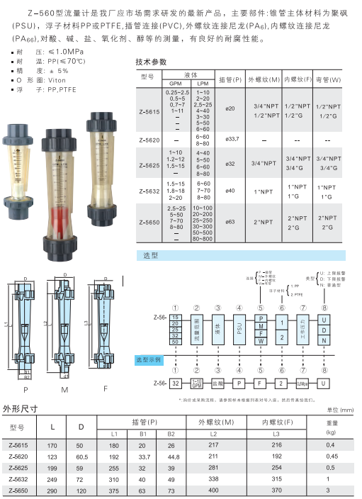 Z-560型流量计,主要部件:锥管材料 聚砜(PSU),浮子材料PP或PTFE,插管连接(PVC),外螺纹连接尼龙(PA6),内螺纹连接尼龙(PA66),对酸、碱、盐、氧化剂、醇等的测量,有良好的耐腐性能。